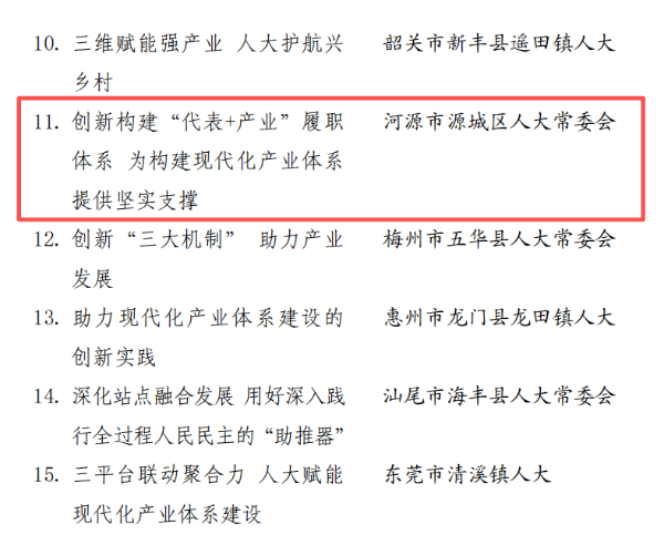 第八届广东省县乡人大工作创新案例评选结果揭晓。源城区人大常委会申报的《创新构建“代表+产业”履职体系 为构建现代化产业体系提供坚实支撑》案例成功入选,成为全省优秀创新案例之一,也是我市今年唯一入选的案例。