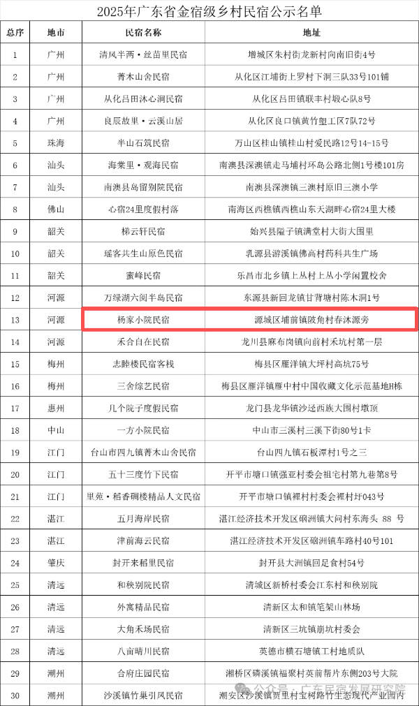 广东省文化和旅游厅公布2025年全省乡村酒店(民宿)等级评定公示名单。其中,杨家小院民宿凭借扎实的文旅发展基础与优质的旅居服务,成功入选金宿级乡村民宿。
