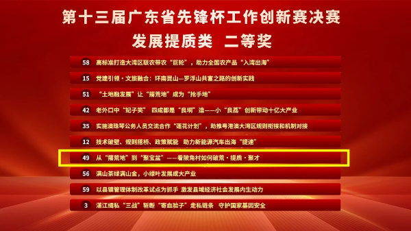 第十三届广东省“先锋杯”工作创新赛决赛圆满落幕。大赛以“抓党建促发展 聚合力谋新篇”为主题,分发展提质、服务增效、党建赋能三个类别,共有来自全省21个地市党政机关以及省直、中直驻粤单位约5000个项目参赛。经过激烈角逐,埔前镇创新案例《从“撂荒地”到“聚宝盆”——看陂角村如何破荒·提质·聚才》在全省众多优秀案例中脱颖而出,以91.476的高分荣获决赛“发展提质”类别二等奖。
