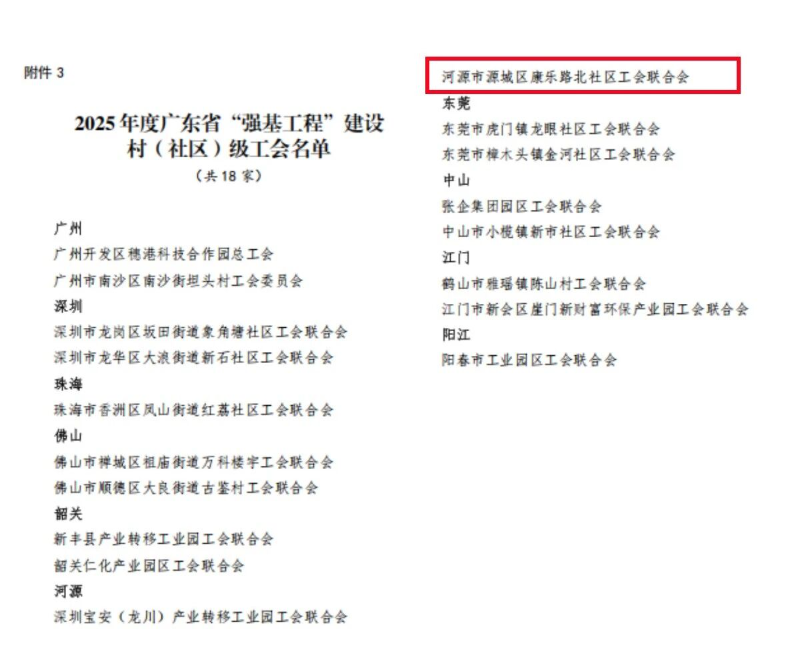 日前,广东省总工会办公室公布2025年度省“强基工程”建设村(社区)级工会认定名单,全省共18家单位上榜,源城区康乐路北社区工联会赫然在列,且是河源市仅有的两家入选单位之一!
