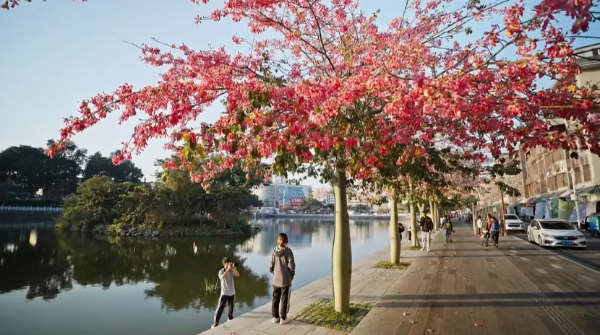 朝雾初散,阳光轻洒沿湖健身步道,跑友们迎着晨曦与花香奔跑,成为“跑阅鳄湖·时光之旅”的日常写照。脚步踏过崭新的沥青路面,身旁是粉花映水的盛景,呼吸间满是草木与阳光的清新。抬眼望去,经过风貌提升的湖滨路,白墙棕木勾勒出素雅轮廓,飞檐叠韵错落有致,沿街商铺立面整洁雅致,“三线”规整入地,昔日的杂乱已被古朴精致取代,老街肌理在保护中焕发新生。途经景观打卡点,随手定格花、湖、古街相融的瞬间,每一步,都在丈量城市更新的惊喜。