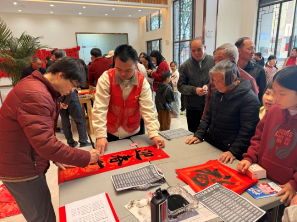 社区里、商圈边,书法家和书法爱好者们摆开笔墨,免费为群众义写春联、送福字,红纸上的一笔一划都满是新春的美好祝福。“想要一副带平安的,再要一副添福气的。”居民们围在桌前挑选心仪的春联,墨香四溢间,一张张笑脸、一副副红联,把新春的喜庆氛围拉满,大家拿着红彤彤的春联和福字,心里甜滋滋的。