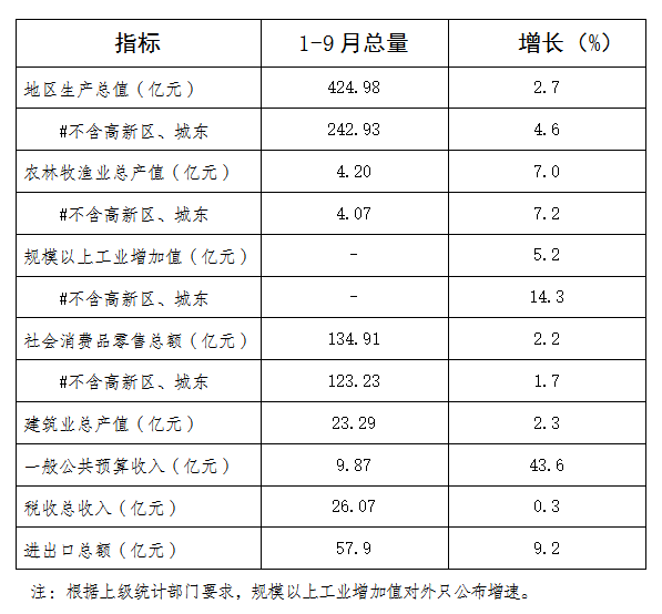 根据河源市地区生产总值统一核算结果,2025年前三季度我区地区生产总值424.98亿元(行政辖区),同比增长2.7%。其中,第一产业增加值2.73亿元,增长7.0%;第二产业增加值177.84亿元,增长3.8%;第三产业增加值244.41亿元,增长1.8%。
